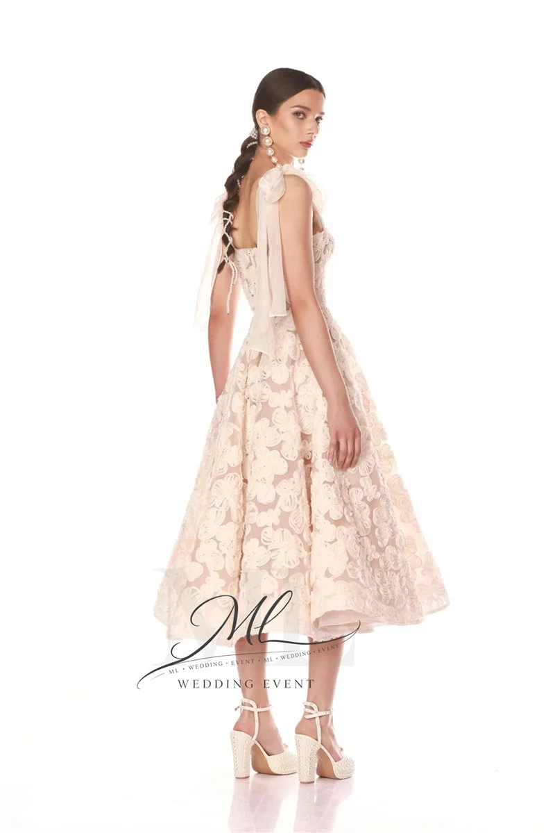ML Customized Off-White Milk Lace Flower Wedding Dress Bow Straps Tea-length Vestidos De Noche A-line Bride Formal Gown